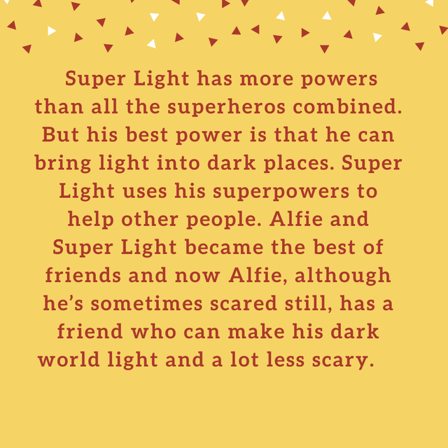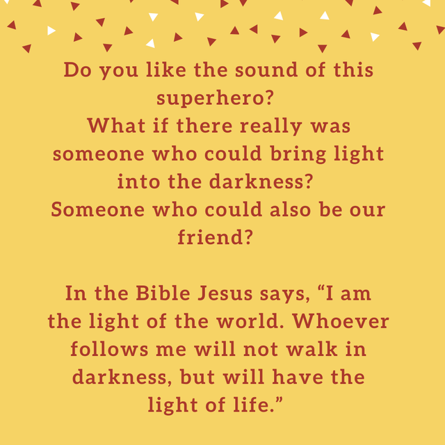 Bundle of 20 for £8 The Super Light is a simple story of a boy called Alfie and a superhero called Super Light. It ends asking the question... "What if there really was someone who could bring light into the darkness? Someone who could also be our friend? In the Bible Jesus says, “I am the light of the world. Whoever follows me will not walk in darkness, but will have the light of life.” Size - 148mm x 148mm square 8pp (8 sides) saddle stitched booklets Pages include; Spot the difference, word search, draw your own super hero, find your own super hero name, a space to put your contact details and a short story.