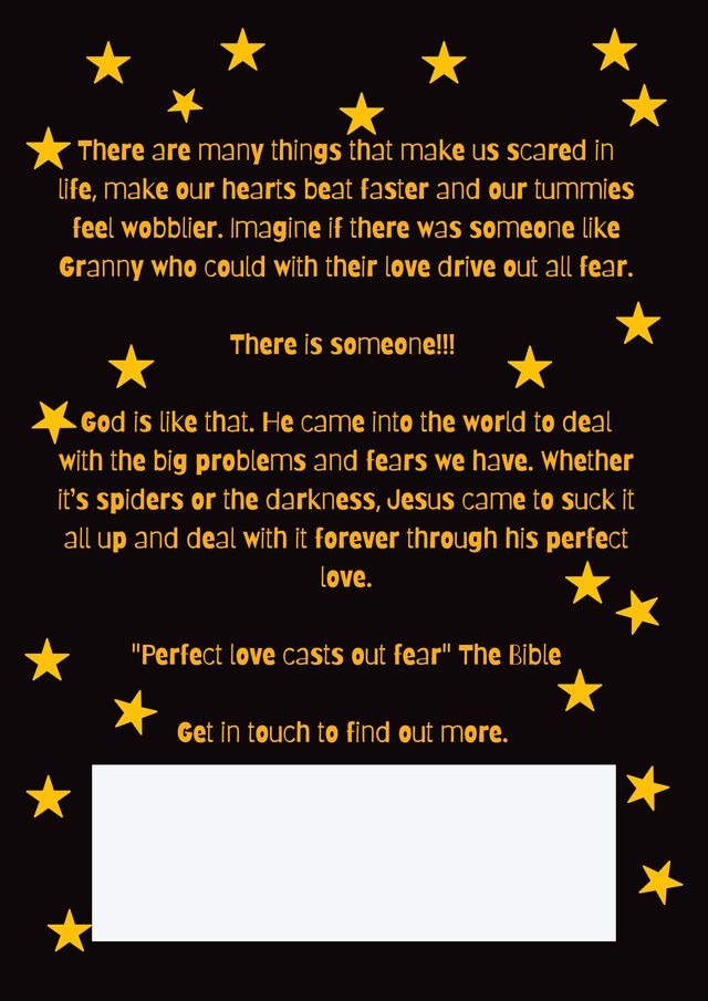 Bundle of 20 for £5.00 The leaflet is a simple story about two boys and their fear of spiders and ending asking the reader to imagine if there was someone who could with their love drive out fear. Size - A4 cross-folded to A6 leaflets Pages include; spot the difference, fun facts about spiders, draw your own and a short story If you'd like some ideas how to give these away have a look at the Passion for Evangelism website